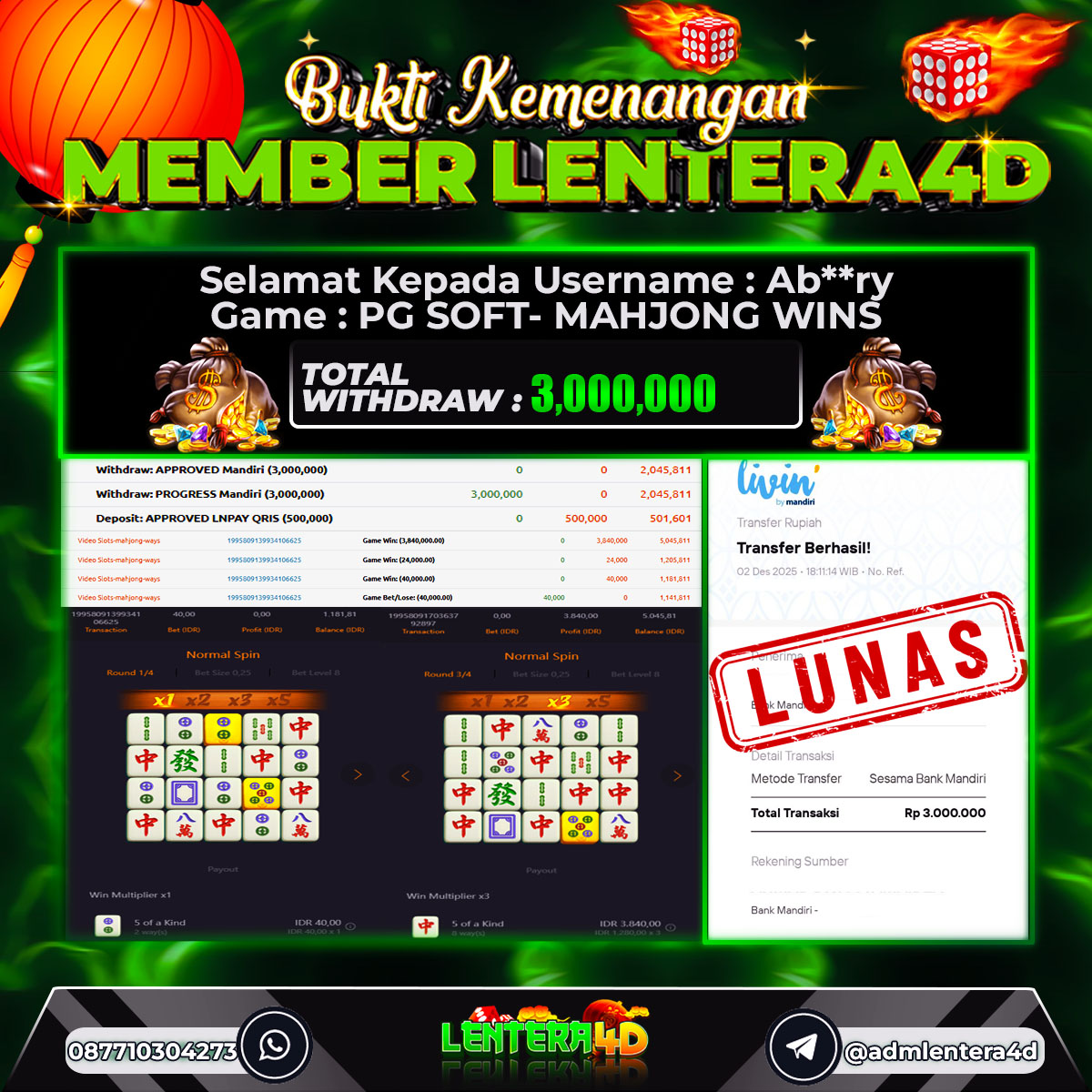 Satu lagi Bukti JP dan Pembarayan Sah Dan Dapat Dipertanggung Jawabkan, WD Berapapun Pasti Dibayar Lunas Hanya di Situs LENTERA 4D. Hati Hati Kepada Pihak Pihak Yang Mengatas namakan Pihak LENTERA4D Untuk Melakukan Penipuan.