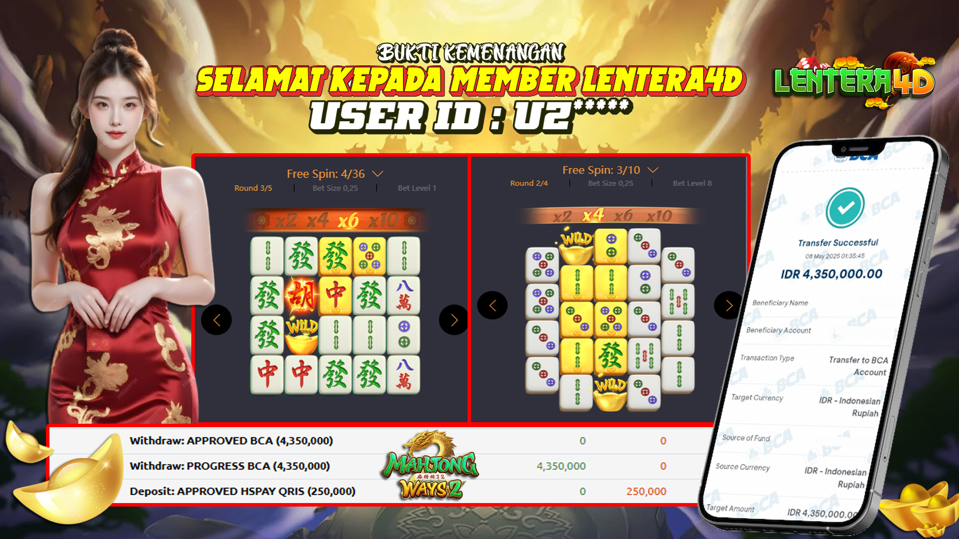 Lentera4D dikenal sebagai situs terpercaya yang selalu menghadirkan pengalaman bermain slot online yang aman, fair, dan berlisensi resmi. Di sini, kami tidak hanya sekadar memberikan janji, tapi bukti nyata berupa slip kemenangan yang dapat Anda lihat secara langsung.