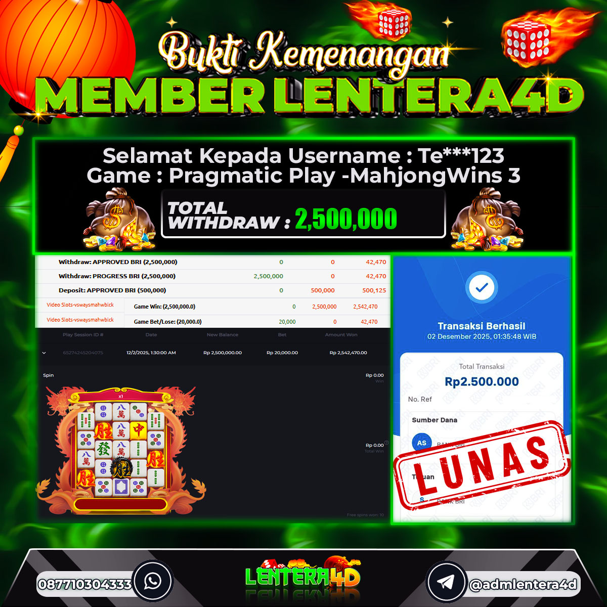 TOTAL KEMENANGAN : Rp 2.500.000,-